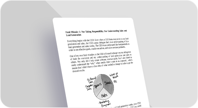 Fatal Mistake 1: Not Taking Responsibility For Understanding Sales and Lead Generation Everything begins with the CEO. Even when a CEO hires executives to run lead generation and sales, the CEO cannot delegate their own understanding of how lead generation and sales works. The CEO must understand the fundamentals in order to set effective goals, coach executives, and solve revenue problems. One of my own fatal mistakes as the CEO of LeaseExchange was my delegation of both the execution and my understanding of lead generation and sales to others. Not only did I help create arbitrary revenue goals, but I also failed to really understand the “why” when results didn’t come in as expected... which means that I didn’t have a clear idea of what needed to change in order to get the desired results. By having an understanding of how sales and lead generation works, your CEO can help create realistic plans and visions for the team. The CEO can avoid arbitrary goals, assumptions, and plans, and thus run a much faster growing, profitable company. Solution: The CEO takes full responsibility for educating themselves, whether indirectly through coaching, or directly by getting involved in actual projects.