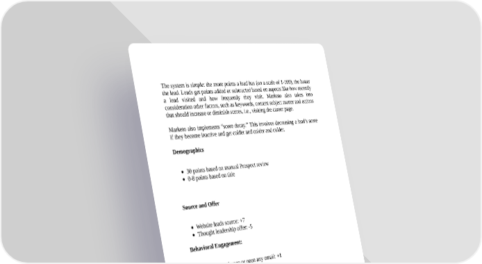 The system is simple: the more points a lead has (on a scale of 1-100), the hotter the lead. Leads get points added or subtracted based on aspects like how recently a lead visited and how frequently they visit. Marketo also takes into consideration other factors, such as keywords, content subject matter and actions that should increase or diminish scores, i.e., visiting the career page. Marketo also implements “score decay.” This involves decreasing a lead’s score if they become inactive and get colder and colder and colder. Demographics 30 points based on manual Prospect review 0-8 points based on title Source and Offer Website leads source: +7 Thought leadership offer: -5 Behavioral Engagement: Visit any webpage or open any email: +1 Watch demos: +5 each Register for webinar: +5 Attend webinar: +5 Download thought leadership: +5 Download Marketo reviews: +12 More than 8 pages in one visit: +7 Visit website 2x in one week: +8 Search for “Marketo”: +15 Visit pricing pages: +5 Visit careers pages: -10 (I especially love this one!) No Activity in One Month:
