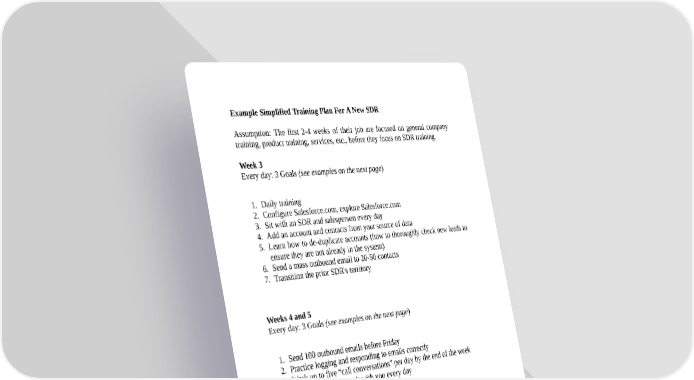 Example Simplified Training Plan For A New SDR Assumption: The first 2-4 weeks of their job are focused on general company training, product training, services, etc., before they focus on SDR training. Week 3 Every day: 3 Goals (see examples on the next page) 1. Daily training 2. Configure Salesforce.com, explore Salesforce.com 3. Sit with an SDR and salesperson every day 4. Add an account and contacts from your source of data 5. Learn how to de-duplicate accounts (how to thoroughly check new leads to ensure they are not already in the system) 6. Send a mass outbound email to 20-50 contacts 7. Transition the prior SDR's territory Weeks 4 and 5 Every day: 3 Goals (see examples on the next page) 1. Send 100 outbound emails before Friday 2. Practice logging and responding to emails correctly 3. Work up to five “call conversations” per day by the end of the week 4. Have a veteran SDR sit with you every day 5. Draft a personal dashboard 6. Discuss a new section of the training materials with the team Sample Beginning Daily Goals Pick a new online Salesforce.com training module to study Call five old (not cold) leads in the system, to practice discussing their needs in a business conversation "Ideal Customer Profile" discussion with teammate Learn about the "Account Status" stages