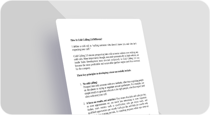 How Is Cold Calling 2.0 Different? I define a cold call is “calling someone who doesn’t know you and who isn’t expecting your call.” Cold Calling 2.0 means prospecting into cold accounts without ever making any cold calls. More importantly though, executed systematically in high-volume, an inside Sales Development team devoted exclusively to Cold Calling 2.0 can become the most predictable and sustainable pipeline engine (and thus revenue) for the company. Three key principles to developing a team successfully include: 1. No cold calling! Prospect into cold accounts with new methods, other than surprising people on the phone or trying to negotiate around gatekeepers. For example, use simple emails to generate referrals to the right people, who then expect (and often welcome) your call. 2. A focus on results, not activities! That means that dials and calls per day, or even appointments set, are much less interesting or even important. Rather, track metrics such as qualification calls per dayor week, and qualified opportunities per month. Calls per day and dials are usually only tracked during training periods, for coaching purposes while reps ramp up their pipelines. 3. Everything is systematically process-driven! This includes management practices, hiring, training, and of course, the actual prospecting process. By emphasizing repeatability and consistency, the pipeline and revenue ramps generated by a new Sales Development Rep become very predictable, and the entire team’s results become highly sustainable. You must carve out time to work on these "important but not urgent" priorities. As with eating well and staying away from junk food, it takes discipline and
