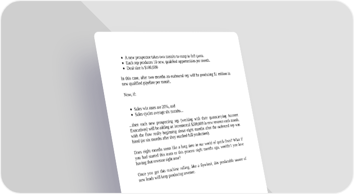 A new prospector takes two months to ramp to full quota. Each rep produces 10 new, qualified opportunities per month. Deal size is $100,000 In this case, after two months an outbound rep will be producing $1 million in new qualified pipeline per month. Now, if: Sales win rates are 20%, and Sales cycles average six months... ...then each new prospecting rep (working with their quotacarrying Account Executives) will be adding an incremental $200,000 in new revenue each month, with the flow really beginning about eight months after the outbound rep was hired (or six months after they reached full production). Does eight months seem like a long time in our world of quick-fixes? What if you had started this team or this process eight months ago, wouldn’t you love having that revenue right now? Once you get this machine rolling, like a flywheel, this predictable source of new leads will keep producing revenue.