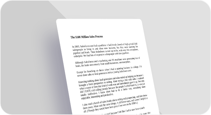 The $100 Million Sales Process In 2003, Salesforce.com had a problem: it had hired a bunch of high-priced field salespeople to bring in and close new business, but they were starving for pipeline and leads. Their Rolodexes turned out to be, with very few exceptions, unhelpful. We had lots of expensive salespeople with thin pipelines. Although Salesforce.com’s marketing and PR machines were generating lots of leads, the leads were mostly from small businesses, not enterprises. Except for knocking on doors when I had a painting business in college, I’d never done sales or lead generation before joining Salesforce.com. Knowing nothing about lead generation and sales ended up helping me because I brought a fresh perspective to selling. After trying a few cold calls, I realized what a waste of time that kind of work was and immediately gave it up. Not only did I HATE cold calling (mostly because the people I called hated it), it was just totally ineffective. I knew there had to be a better way, something more enjoyable, interesting and productive. I also read a bunch of sales books about selling and prospecting, and then threw them away. Most said the same things, in different ways, and weren’t helpful at all. (Though they would have been great if we were in the 1980’s.) At first I felt really frustrated, because I felt like I had to start from scratch. I ended up creating a sales prospecting process and inside sales team that consistently generated new qualified sales opportunities for the quotacarrying salespeople. Nearly everything changed. The team no longer had to qualify website leads. The team didn’t handle sales order paperwork. The team didn’t close small deals. The team didn’t help out marketing. The team wasn’t distracted. Instead, the team had a single mission: to generate (but not by cold calling; see