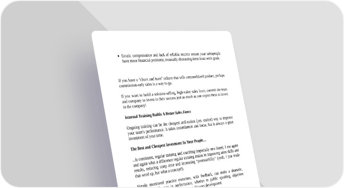 Erratic compensation and lack of reliable income means your salespeople have more financial problems, ironically distracting them from work goals. If you have a “churn and burn” culture that sells commoditized product, perhaps commission-only sales is a way to go. If you want to build a solution-selling, high-value sales force, commit the team and company to invest in their success just as much as you expect them to invest in the company! Internal Training Builds A Better Sales Force Ongoing training can be the cheapest and easiest (yes, easiest) way to improve your team's performance. It takes commitment and focus, but is always a great investment of your time. The Best and Cheapest Investment In Your People… ...is consistent, regular training and coaching (especially new hires). I see again and again what a difference regular training makes in improving sales skills and results, reducing ramp time and increasing “promotability” (yeah, I just made that word up, but what a concept!). Simple monitored practice exercises, with feedback, can make a dramatic, noticeable difference in performance, whether in public speaking, objection handling, phone skills, demos or personal/career development. What Works A program with an ongoing, regular format. Includes exercises/role-playing and useful feedback. Is designed effectively, to make it worth your reps' time. Follow through on everything: maintain the schedule, check progress, keep it fresh and don't let things slip.