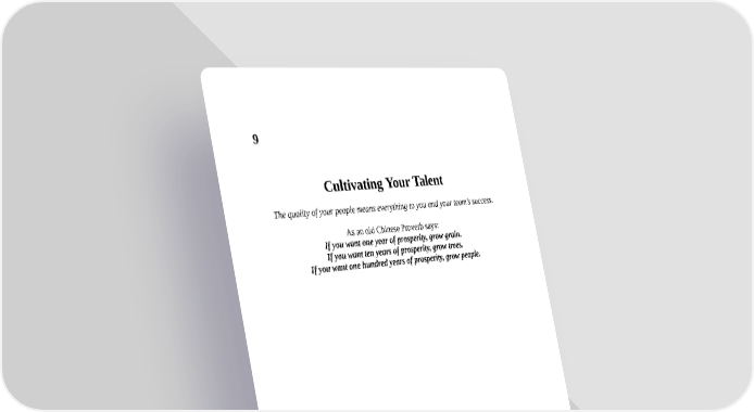 9 Cultivating Your Talent The quality of your people means everything to you and your team’s success. As an old Chinese Proverb says: If you want one year of prosperity, grow grain. If you want ten years of prosperity, grow trees. If you want one hundred years of prosperity, grow people.