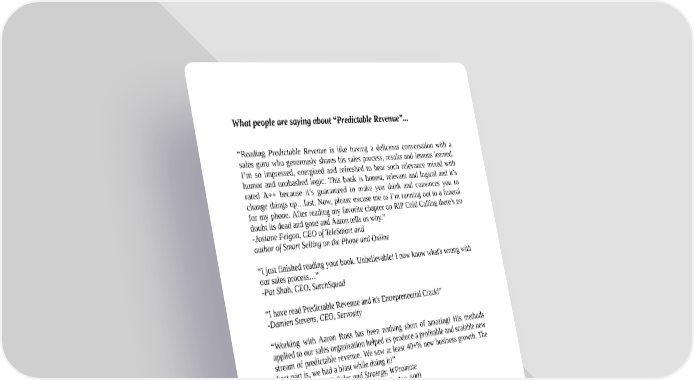 What people are saying about “Predictable Revenue”... “Reading Predictable Revenue is like having a delicious conversation with a sales guru who generously shares his sales process, results and lessons learned. I’m so impressed, energized and refreshed to hear such relevance mixed with humor and unabashed logic. This book is honest, relevant and logical and it’s rated A++ because it’s guaranteed to make you think and convinces you to change things up…fast. Now, please excuse me as I’m running out to a funeral for my phone. After reading my favorite chapter on RIP Cold Calling there’s no doubt its dead and gone and Aaron tells us why.” -Josiane Feigon, CEO of TeleSmart and author of Smart Selling on the Phone and Online “I just finished reading your book. Unbelievable! I now know what's wrong with our sales process…” -Pat Shah, CEO, SurchSquad “I have read Predictable Revenue and it's Entrepreneurial Crack!” -Damien Stevens, CEO, Servosity “Working with Aaron Ross has been nothing short of amazing! His methods applied to our sales organization helped us produce a profitable and scalable new stream of predictable revenue. We saw at least 40+% new business growth. The best part is, we had a blast while doing it!” -Michael Stone, VP Sales and Strategy, WPromote (#1 ranked Search Marketing Firm on the Inc. 500) “The concept of the sales machine is brilliant. Aaron has done a great jobdistilling a complex concept into a simple-to-read, consummate bible for entrepreneurs and executives.” -Promise Phelon, CEO, UpMo “Aaron has created a work that is useful to established companies and entrepreneurs. The material is easily digested and applicable to businesses large and small.” -Brent Mellow, CEO, akaCRM