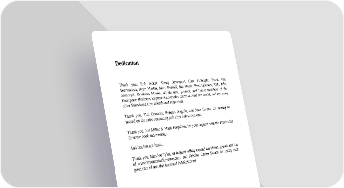 Dedication Thank you, Rob Acker, Shelly Davenport, Cary Fulbright, Frank Van Veenendaal, Ryan Martin, Marc Benioff, Jim Steele, Brett Queener, RTL, John Somorjai, Erythean Martin, all the past, present, and future members of the Enterprise Business Representative sales teams around the world, and my many other Salesforce.com friends and supporters. Thank you, Tim Connors, Roberto Angulo, and John Girard, for getting me started on the sales consulting path after Salesforce.com. Thank you, Jon Miller & Maria Pergolino, for your support with the Predictable Revenue book and message. And last but not least… Thank you, Marylou Tyler, for helping wildly expand the vision, growth and fun of www.PredictableRevenue.com, and Kristine Castro Sloane for taking such great care of me, this book and PebbleStorm!