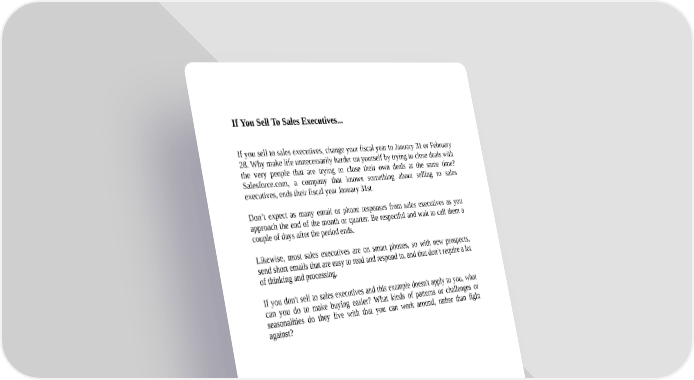 If You Sell To Sales Executives... If you sell to sales executives, change your fiscal year to January 31 or February 28. Why make life unnecessarily harder on yourself by trying to close deals with the very people that are trying to close their own deals at the same time? Salesforce.com, a company that knows something about selling to sales executives, ends their fiscal year January 31st. Don’t expect as many email or phone responses from sales executives as you approach the end of the month or quarter. Be respectful and wait to call them a couple of days after the period ends. Likewise, most sales executives are on smart phones, so with new prospects, send short emails that are easy to read and respond to, and that don’t require a lot of thinking and processing. If you don't sell to sales executives and this example doesn't apply to you, what can you do to make buying easier? What kinds of patterns or challenges or seasonalities do they live with that you can work around, rather than fight against?
