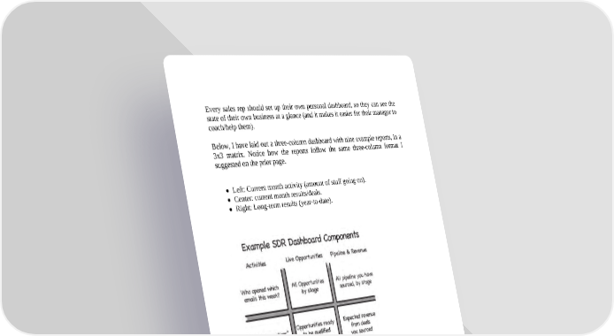 Every sales rep should set up their own personal dashboard, so they can see the state of their own business at a glance (and it makes it easier for their manager to coach/help them). Below, I have laid out a three-column dashboard with nine example reports, in a 3x3 matrix. Notice how the reports follow the same three-column format I suggested on the prior page. Left: Current month activity (amount of stuff going on). Center: current month results/deals. Right: Long-term results (year-to-date). Every team is different, and while for outbound sales you should use the above key metrics and reports as a foundation, you will have to customize everything to fit your own needs.