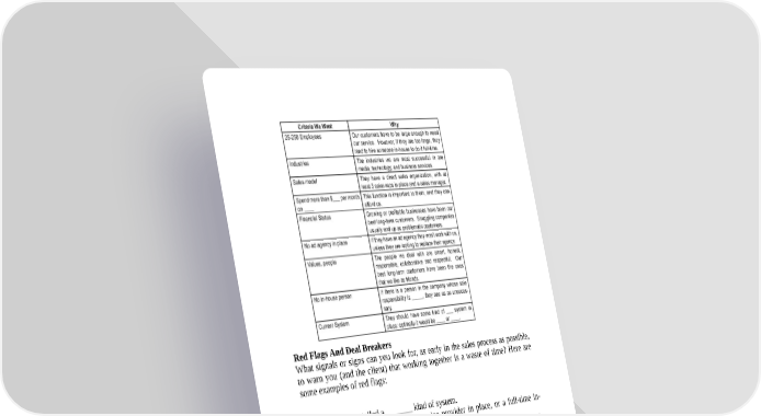 Red Flags And Deal Breakers What signals or signs can you look for, as early in the sales process as possible, to warn you (and the client) that working together is a waste of time? Here are some examples of red flags: They just installed a _______ kind of system. They already have an agency/service provider in place, or a full-time in- house person dedicated to ___. They churn-and-burn the consultants or agencies they hire to do _____________. Know-it-alls / “We know what we’re doing.” Geography. Their monthly budget for ________ is only ________. These industries never seem to work: _____, _____, _____. This area of work is totally new to them, and they don’t understand it yet. (That is, you would have to do a lot of education of the client before they would even understand the value of your service.)