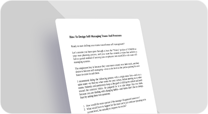 How To Design Self-Managing Teams And Processes Ready to start shifting your teams toward more self-management? Let’s assume you have gone through at least the “Vision” portion of V2MOM or your own planning process, and your team has created a vision that includes a full or partial method of turning your employees into miniCEOs with more self- managing systems. The employees buy in because they want more control over their work, and they desire to become self-managing—even to the level of the janitor picking his own hours to come in and clean. I recommend doing the following process with a single team first—such as a sales team—to find out what works for your culture, before moving on to other teams. Patiently and persistently keep at the goal of shifting the culture and team toward the common vision. Be prepared for it to take longer than you think, because you are dealing with changing habits—and habits don’t like to change. Start by asking these two questions: 1. How would the team operate if the manager disappeared tomorrow? 2. What would have to happen for the team not to just continue operating at its current level, but actually to improve its results? For example, here are some common key responsibilities of a VP Sales: 1. Goal setting and achievement 2. Personal involvement in big deals 3. Culture 4. Compensation—designing, calculating, reporting 5. Talent—structuring roles, hiring, firing 6. Coaching 7. Analysis and reporting 8. Budgeting / expenditures
