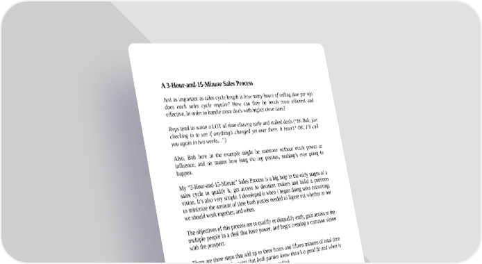 A 3-Hour-and-15-Minute Sales Process Just as important as sales cycle length is how many hours of selling time per rep does each sales cycle require? How can they be much more efficient and effective, in order to handle more deals with higher close rates? Reps tend to waste a LOT of time chasing early and stalled deals (“Hi Bob, just checking in to see if anything’s changed yet over there. It hasn’t? OK, I’ll call you again in two weeks…”) Also, Bob here in the example might be someone without much power or influence, and no matter how long the rep persists, nothing’s ever going to happen. My “3-Hour-and-15-Minute” Sales Process is a big help in the early stages of a sales cycle to qualify it, get access to decision makers and build a common vision. It’s also very simple. I developed it when I began doing sales consulting, to minimize the amount of time both parties needed to figure out whether or not we should work together, and when. The objectives of this process are to qualify or disqualify early, gain access to the multiple people in a deal that have power, and begin creating a common vision with the prospect. There are three steps that add up to three hours and fifteen minutes of total time invested to get to the point that both parties know there’s a good fit and when is the right time to engage (even if that is not today). Step 1: (15 Minutes) First Contact: “Is This A Waste Of Time?” Imagine you are referred to someone, or get a response from a prospect and have a first chat with them. You can take fifteen minutes with them to figure out whether or not it’s a waste of time to speak further. Frankly, everyone’s so busy and overwhelmed these days that they appreciate being told what to do, so that they don’t have to think. In this first call, start setting expectations right away. Lay out your process for the prospect in the best way to mutually figure out the fit, and position it in a way that benefits them.