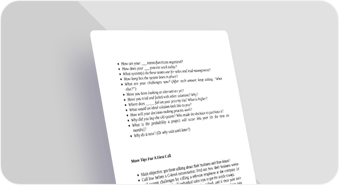 How are your ___ teams/functions organized? How does your ___ process work today? What system(s) do these teams use for sales and lead management? How long has the system been in place? What are your challenges now? (After each answer, keep asking, “What else?”) Have you been looking at alternatives yet? Have you tried and failed with other solutions? Why? Where does _____ fall on your priority list? What is higher? What would an ideal solution look like to you? How will your decision-making process work? Why did you buy the old system? Who made the decision to purchase it? What is the probability a project will occur this year [in the next six months]? Why do it now? (Or why wait until later?) More Tips For A First Call Main objective: get them talking about their business and then listen!! Call low before a C-level conversation: Find out how their business works and current challenges by calling a relevant employee at the company (at Salesforce.com, we’d call individual sales reps to get the inside scoop). Try being (respectfully) blunt: After you’ve talked, and if their pain isn’t obvious, ask straight out if there is any pain: “Where do you have pain today? What’s not working as well is it should?” Keep asking questions until you’ve exhausted the hunt for pain—their challenges. Keep digging until there’s nothing left to uncover. Ask for referrals: Who else should you talk to at other divisions / teams? Scheduling via email is a huge time waster. Always work to schedule your next step while you’re on the phone. Remember, experiment and test these questions and practices to see what works for your people and business. You will have to customize, tweak and test to get great results that are repeatable.