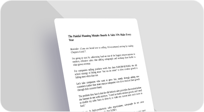 The Painful Planning Mistake Boards & Sales VPs Make Every Year Reminder: if you are brand new to selling, I'd recommend starting by reading Chapters 6 and 7. I'm going to start by addressing head-on one of the biggest misconceptions in modern, effective sales: that adding salespeople and working them harder is what grows revenue. For companies selling products worth less than $100,000-$250,000, the old school strategy of hiring more “feet on the street” to drive revenue growth is failing more often than not. Let's take companies who want to grow fast, mostly through adding new customers (rather than more mature companies who drive much of their growth through their customer base). The problem they face is that the old bedrock sales principles that worked before the Internet do not work anymore. "I need to double revenue growth, and I need to double my sales force to drive it, or make my current team work twice as hard." Wrong. In high-productivity sales organizations, salespeople do not cause customer acquisition growth, they fulfill it. This is a huge shift in traditional sales thinking. I'm talking about root cause drivers, not correlations. Of course you need more salespeople if you're getting bigger, but they aren't what is causing the bulk of new customer growth. Also, while they are quite popular and simple sales strategies of CEOs, sales executives and salespeople, "work harder" and "make more calls" don't scale. Most salespeople already work enough hours, and trying to get them to work harder is like trying to solve a problem by going faster in the wrong direction. It's bailing water out of the boat faster rather than fixing the leak.