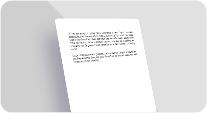 If you see prospects getting stuck somewhere in your “layers,” consider redesigning your next-step offers. What is the next “juicy morsel” they would want if you showed it to them, that would help them take another step forward? What new layers, content or products can you create that are compelling and relevant to who the prospect is and where they are in their evaluation and buying cycle? Let go of trying to control prospects, and trust that if it’s a good mutual fit, and you keep nurturing them, and your “layers” are relevant and useful, they will become a customer someday!