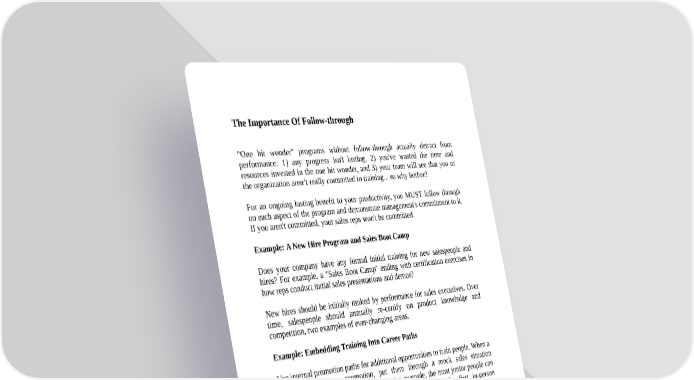The Importance Of Follow-through "One hit wonder" programs without follow-through actually detract from performance: 1) any progress isn't lasting, 2) you've wasted the time and resources invested in the one hit wonder, and 3) your team will see that you or the organization aren’t really committed to training... so why bother? For an ongoing lasting benefit to your productivity, you MUST follow through on each aspect of the program and demonstrate management's commitment to it. If you aren't committed, your sales reps won't be committed. Example: A New Hire Program and Sales Boot Camp Does your company have any formal initial training for new salespeople and hires? For example, a "Sales Boot Camp" ending with certification exercises in how reps conduct initial sales presentations and demos? New hires should be initially ranked by performance for sales executives. Over time, salespeople should annually re-certify on product knowledge and competition, two examples of ever-changing areas. Example: Embedding Training Into Career Paths Use internal promotion paths for additional opportunities to train people. When a salesperson wants a promotion, put them through a mock sales situation depending on their level of experience. For example, the most junior people can go through a "first call customer pitch" presentation (the first in-person presentation to a prospect company) as their promotion interview. This both gives the interviewing sales executives a chance to assess potential, and incents salespeople to invest in developing the skills they need to get to the next sales level (public speaking, objection handling, etc.).