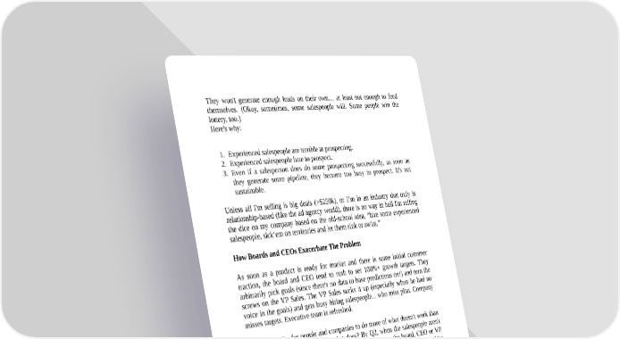 They won't generate enough leads on their own… at least not enough to feed themselves. (Okay, sometimes, some salespeople will. Some people win the lottery, too.) Here's why: 1. Experienced salespeople are terrible at prospecting. 2. Experienced salespeople hate to prospect. 3. Even if a salesperson does do some prospecting successfully, as soon as they generate some pipeline, they become too busy to prospect. It's not sustainable. Unless all I'm selling is big deals (>$250k), or I’m in an industry that truly is relationship-based (like the ad agency world), there is no way in hell I'm rolling the dice on my company based on the old-school idea, “hire some experienced salespeople, sick‘em on territories and let them sink or swim.” How Boards and CEOs Exacerbate The Problem As soon as a product is ready for market and there is some initial customer traction, the board and CEO tend to rush to set 100%+ growth targets. They arbitrarily pick goals (since there's no data to base predictions on!) and turn the screws on the VP Sales. The VP Sales sucks it up (especially when he had no voice in the goals) and gets busy hiring salespeople... who miss plan. Company misses targets. Executive team is refreshed. Why is it easier for people and companies to do more of what doesn't work than to take some time to figure out what does? By Q2, when the salespeople aren't making their 2010 numbers, there will be the push (from the board, CEO or VP Sales themselves) to hire more! "We're behind on our goals; we need to hire more salespeople!" How does that make sense?! Why do CEOs and boards keep making this same dumb mistake? People, when under pressure or stress, tend to retreat to the safe place of what they know rather than taking the risk of trying new things. People tend to do more of what is not working rather than stepping back, taking a breather, and trying to figure out a new approach. Some Answers