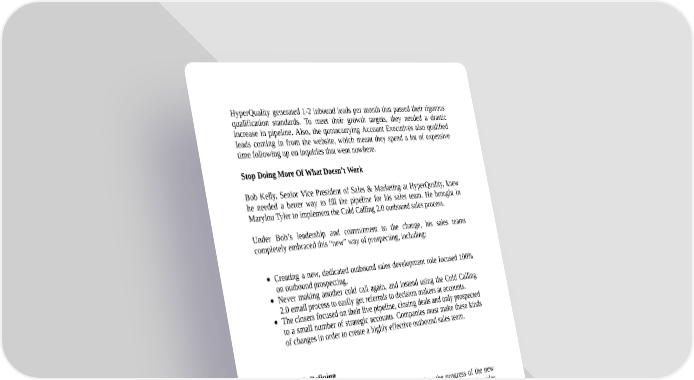 HyperQuality generated 1-2 inbound leads per month that passed their rigorous qualification standards. To meet their growth targets, they needed a drastic increase in pipeline. Also, the quotacarrying Account Executives also qualified leads coming in from the website, which meant they spend a lot of expensive time following up on inquiries that went nowhere. Stop Doing More Of What Doesn’t Work Bob Kelly, Senior Vice President of Sales & Marketing at HyperQuality, knew he needed a better way to fill the pipeline for his sales team. He brought in Marylou Tyler to implement the Cold Calling 2.0 outbound sales process. Under Bob’s leadership and commitment to the change, his sales teams completely embraced this “new” way of prospecting, including: Creating a new, dedicated outbound sales development role focused 100% on outbound prospecting. Never making another cold call again, and instead using the Cold Calling 2.0 email process to easily get referrals to decision makers at accounts. The closers focused on their live pipeline, closing deals and only prospected to a small number of strategic accounts. Companies must make these kinds of changes in order to create a highly effective outbound sales team. Testing & Refining Bob and the team met weekly with Marylou to review the progress of the new initiative. Each week, the first topic discussed on the company-wide sales agenda was the new outbound sales process, reviewing metrics such as: Email response rates (usually 7-10%) What e-mails are companies responding to, and why Who is responding (title, position of authority) Number of Scoping Calls completed Who became a qualified opportunity, and why Refinements to the Ideal Customer Profile (which was revised many, many