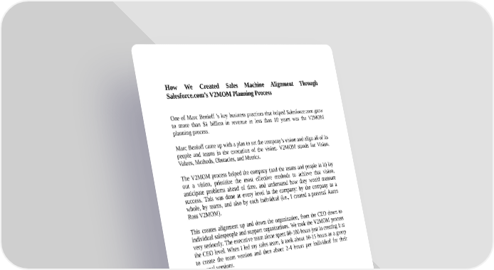 How We Created Sales Machine Alignment Through Salesforce.com’s V2MOM Planning Process One of Marc Benioff ’s key business practices that helped Salesforce.com grow to more than $1 billion in revenue in less than 10 years was the V2MOM planning process. Marc Benioff came up with a plan to set the company’s vision and align all of its people and teams in the execution of the vision. V2MOM stands for Vision, Values, Methods, Obstacles, and Metrics. The V2MOM process helped the company (and the teams and people in it) lay out a vision, prioritize the most effective methods to achieve that vision, anticipate problems ahead of time, and understand how they would measure success. This was done at every level in the company: by the company as a whole, by teams, and also by each individual (i.e., I created a personal Aaron Ross V2MOM). This creates alignment up and down the organization, from the CEO down to individual salespeople and support organizations. We took the V2MOM process very seriously. The executive team alone spent 80-100 hours just in creating it at the CEO level. When I led my sales team, it took about 10-15 hours as a group to create the team version and then about 2-4 hours per individual for their personal versions. It was well worth the investment. Below are examples of the five principles of the V2MOM process at each level, so that you can learn from this to try it on your own: 1. VISION: What’s The Big Picture? What is your vision for the next 12 months? Corporate: “Double our enthusiastic and wildly successful global customer and partner community through flawless execution of our proven model.” Team (my sales team):“Make a difference in the success of our team and