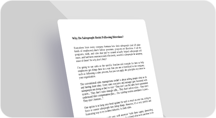 Why Do Salespeople Resist Following Directions? Executives from every company bemoan how their salespeople (and all other kinds of employees) don’t follow processes, programs or directions. If all the programs, tools, and rules that you’ve created actually helped salespeople sell more, and had been communicated effectively, wouldn’t salespeople be adopting more of them? So why don’t they? I’m going to use sales as the specific function and example for how to help employees get things done in a way that you see is beneficial to the company, such as following a sales process, but you can apply the principles anywhere in your organization. The conventional sales management model is about telling people what to do and having them obey. Every sales executive and manager gets frustrated with salespeople not doing as they’re told: “They don’t use the sales force automation system... They don’t make enough calls... They don’t sell to value... They don’t understand their compensation plan… Our training session attendance is poor... They don’t forecast...”. One option is to bang your head against the wall as much as you can, trying to force or coerce salespeople into doing things. However, it’s a very painful and frustrating way to try to drive behavior, for both sides. And it doesn’t even work very well anymore “with these uppity, demanding employees we have now who don’t want to be ordered what to do and how to do it!” Why: 1. People hate to be told what to do; thus coercion naturally creates resistance. How do you feel when someone tells you to do something? (Rather than explaining why something’s important and then asking for your teamwork or help.) Do you want to comply, or do you purposely want to not do it just to show them they can’t tell you what to do? 2. It’s a quick fix, not a solution.