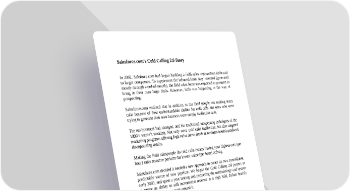 Salesforce.com’s Cold Calling 2.0 Story In 2002, Saleforce.com had begun building a field sales organization dedicated to larger companies. To supplement the inbound leads they received (generated mostly through word-of-mouth), the field sales force was expected to prospect to bring in their own large deals. However, little was happening in the way of prospecting. Salesforce.com realized that in addition to the field people not making many calls because of their understandable dislike for cold calls, the ones who were trying to generate their own business were simply ineffective at it. The environment had changed, and the traditional prospecting techniques of the 1990’s weren’t working. Not only were cold calls ineffective, but also targeted marketing programs offering high value items (such as business books) produced disappointing results. Making the field salespeople do cold calls means having your highest-cost (per hour) sales resource perform the lowest-value (per hour) activity. Salesforce.com decided it needed a new approach to create its own controllable, predictable source of new pipeline. We began the Cold Calling 2.0 project in early 2003, and spent a year testing and perfecting the methodology and system to prove its ability to add incremental revenue at a high ROI, before heavily investing in building a team around it. Why We Refined And Tested The Process For A Year While it took me four months to generate my first highly successful month of new opportunities and qualified pipeline, management had two valid concerns to address before they invested heavily: Will the pipeline turn into revenue? In other words: Will the deals close? Can junior salespeople do this too, that is, can it scale? We promoted a junior salesperson to be a second member on my team. I trained him and he quickly began generating the same results as I had. Also, over the