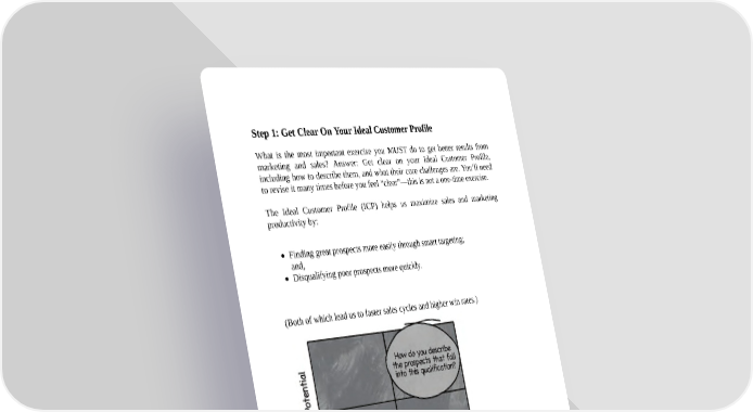 Step 1: Get Clear On Your Ideal Customer Profile What is the most important exercise you MUST do to get better results from marketing and sales? Answer: Get clear on your Ideal Customer Profile, including how to describe them, and what their core challenges are. You’ll need to revise it many times before you feel “clear”—this is not a one-time exercise. The Ideal Customer Profile (ICP) helps us maximize sales and marketing productivity by: Finding great prospects more easily through smart targeting; and, Disqualifying poor prospects more quickly. (Both of which lead us to faster sales cycles and higher win rates.) This is a collection of sample Ideal Customer Profile criteria purely for illustrative purposes, with both positive and red flags. You will need to rewrite all of them from scratch, including adding or subtracting different types of criteria. The ICP should, ideally, fit on a single page.