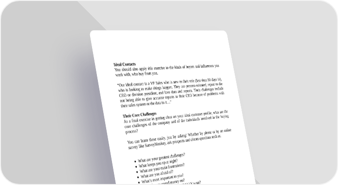 Ideal Contacts You should also apply this exercise to the kinds of buyers and influencers you work with, who buy from you. “Our ideal contact is a VP Sales who is new to their role (less than 90 days in), who is looking to make things happen. They are process-oriented, report to the CEO or division president, and love data and reports. Their challenges include not being able to give accurate reports to their CEO because of problems with their sales system or the data in it…” Their Core Challenges As a final exercise in getting clear on your ideal customer profile, what are the core challenges of the company and of the individuals involved in the buying process? You can learn these easily, just by asking! Whether by phone or by an online survey like SurveyMonkey, ask prospects and clients questions such as: What are your greatest challenges? What keeps you up at night? What are your main frustrations? What are you afraid of? What’s most important to you? What do you spend money on? What do you really, really, REALLY want? Refresh Regularly Finally, you can have more than one kind of "ideal customer" and you also might have "ideal partners." Limit yourself to 1-5 types of profiles. If you think you need more than that, your marketing strategy needs focusing.