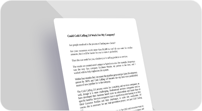 Could Cold Calling 2.0 Work For My Company? Are people involved in the process of finding new clients? Are your customers worth more than $5,000 to you? (It can work for smaller amounts, but it will be harder for you to make it profitable). Then this can work for you, whether you’re selling products or services. The results we created aren’t unique to Salesforce.com. For example, Responsys was the very first company Erythean Martin, my partner at the time, and I worked with to help implement the system. Within four months they increased the pipeline generated per Sales Development person by 300% and Cold Calling 2.0 become the top (and most predictable) source of new pipeline for in the company. The Cold Calling 2.0 process works for consulting and services companies as well, though it is more challenging. Professional services companies tend to have developed their business based more on relationships and brand than on specific benefits. Services companies have to spend extra time honing in on their Ideal Customer Profiles and their challenges, to make this worthwhile. Of course, this is necessary for any lead generation project, not just Cold Calling 2.0. Ultimately, if the will and commitment exists in the CEO and executive team to make it happen, and they can let go of their past cold calling assumptions and follow this new process, it will work.