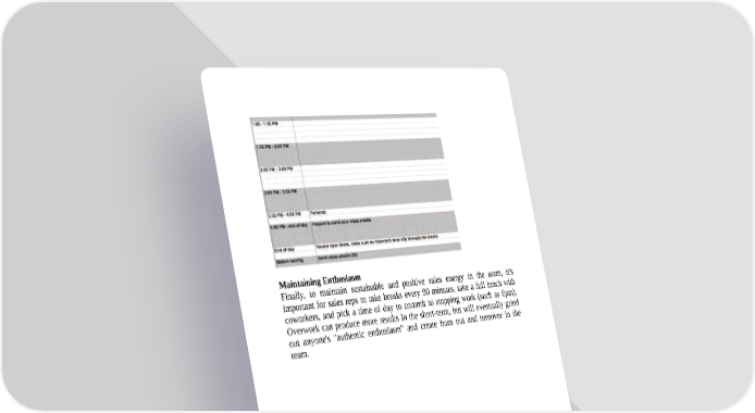 Maintaining Enthusiasm Finally, to maintain sustainable and positive sales energy in the team, it's important for sales reps to take breaks every 90 minutes, take a full lunch with coworkers, and pick a time of day to commit to stopping work (such as 6pm). Overwork can produce more results in the short-term, but will eventually grind out anyone's "authentic enthusiasm" and create burn out and turnover in the team.