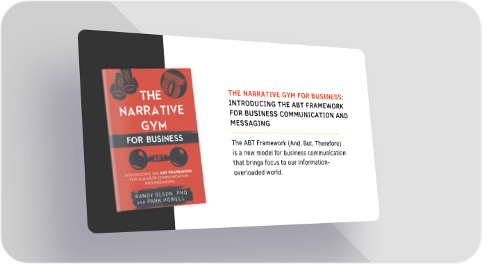 THE NARRATIVE GYM FOR BUSINESS: INTRODUCING THE ABT FRAMEWORK FOR BUSINESS COMMUNICATION AND MESSAGING The ABT Framework (And, But, Therefore) is a new model for business communication that brings focus to our information- overloaded world.