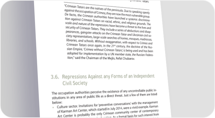 THE AFTERMATHS OF THE OCCUPATION: A POLITICAL REPRESSIONS SYSTEM PART 3 Concurrently with the propaganda campaign, a hostile information background is created, when the Crimean Tatar people are indirectly blamed for all problems of the social life of the Crimean peninsula, whereby the image of the ‘enemy from within’ is created in the eyes of the population. In this connection, the cases of graf- R ti being drawn on the walls of private homes and places of worship of the Crimean Tatar people have become frequent, for example, with the following content: ‘Tatars 32 get out of Crimea’ . “Crimean Tatars are the natives of the peninsula. Due to speaking openly against the occupation of Crimea, they are now the most vulnerable group. De facto, the Crimean authorities have launched a systemic discrimina- tion against Crimean Tatars on racial, ethnic, and religious grounds. The scale and nature of the repressions have become a threat to the lives and security of Crimean Tatars. They include a series of abductions and disap- pearances, gangster attacks on the Crimean Tatar and Ukrainian civil so- ciety representatives, large-scale searches of homes, mosques, madrassas, libraries, and schools. Without exaggeration, with respect to Crimea and st Crimean Tatars once again, in the 21 century, the doctrine of the Rus- sian Empire, ‘Crimea without Crimean Tatars’, is being used and has been adopted for implementation by a UN member state, the Russian Federa- tion,” said the Chairman of the Mejlis, Refat Chubarov. 3.6. Repressions Against any Forms of an Independent Civil Society The occupation authorities perceive the existence of any uncontrollable public in- stitutions in any area of public life as a direct threat. Just a few of them are listed below: • Culture sector. Invitations for ‘preventive conversations’ with the management of Karman Art Center, which started in July 2014, were a vivid example. Karman Art Center is probably the only Crimean community center of contemporary culture, arts, and non-formal education. As a formal basis for such interest from the FSB, the case of the conR ned theater director Oleg Sentsov was used. It is impossible to identify the number of people from the cultural and other walks of life that were interrogated by the FSB in this case that is targeted at searching for potential members of the mythical ‘terrorist organization’ and are potentially under the threat of arrest for political reasons. Due to the real threat to her 32 http://old.kpunews.com/krim_topic7_9614.htm 51