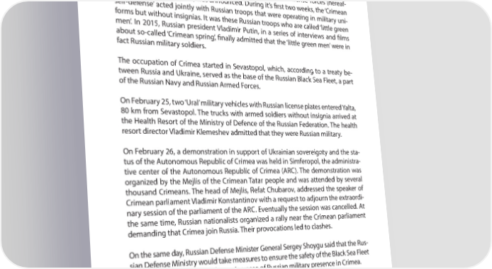 PART 1 THE OCCUPATION OF CRIMEA: CHRONICLE OF SEIZURE there was no open military conU ict, yet still a part of the territory of an independent Ukraine was occupied. The following chronicle of events conR rms these details. On February 23, 2014, at a rally on Nakhimov Square in Sevastopol, Crimea, busi- nessman Alexey Chaly was elected the ‘people’s mayor’ in direct violation of the law of Ukraine. On this day, the formation of so-called ‘self-defense’ forces (hereaf- ter, ‘Crimean self-defense’) was announced. During it’s R rst two weeks, the ‘Crimean self-defense’ acted jointly with Russian troops that were operating in military uni- forms but without insignias. It was these Russian troops who are called ‘little green men’. In 2015, Russian president Vladimir Putin, in a series of interviews and R lms about so-called ‘Crimean spring’, R nally admitted that the ‘little green men’ were in fact Russian military soldiers. The occupation of Crimea started in Sevastopol, which, according to a treaty be- tween Russia and Ukraine, served as the base of the Russian Black Sea Fleet, a part of the Russian Navy and Russian Armed Forces. On February 25, two ‘Ural’ military vehicles with Russian license plates entered Yalta, 80 km from Sevastopol. The trucks with armed soldiers without insignia arrived at the Health Resort of the Ministry of Defence of the Russian Federation. The health resort director Vladimir Klemeshev admitted that they were Russian military. On February 26, a demonstration in support of Ukrainian sovereignty and the sta- tus of the Autonomous Republic of Crimea was held in Simferopol, the administra- tive center of the Autonomous Republic of Crimea (ARC). The demonstration was organized by the Mejlis of the Crimean Tatar people and was attended by several thousand Crimeans. The head of Mejlis, Refat Chubarov, addressed the speaker of Crimean parliament Vladimir Konstantinov with a request to adjourn the extraordi- nary session of the parliament of the ARC. Eventually the session was cancelled. At the same time, Russian nationalists organized a rally near the Crimean parliament demanding that Crimea join Russia. Their provocations led to clashes. On the same day, Russian Defense Minister General Sergey Shoygu said that the Rus- sian Defense Ministry would take measures to ensure the safety of the Black Sea Fleet in Crimea, which further led to an increase of Russian military presence in Crimea. Early in the morning on February 27, armed people without insignia seized the main administrative buildings of Simferopol – the Council of Ministers and the parlia- ment (Verkhovna Rada) of the ARC. The takeover of these buildings was conR rmed by Ukraine’s Minister of Internal AT airs Arsen Avakov. After the takeover, the center of Simferopol and the city’s main streets were blocked by unmarked soldiers in ve- hicles with Russian license plates. 8