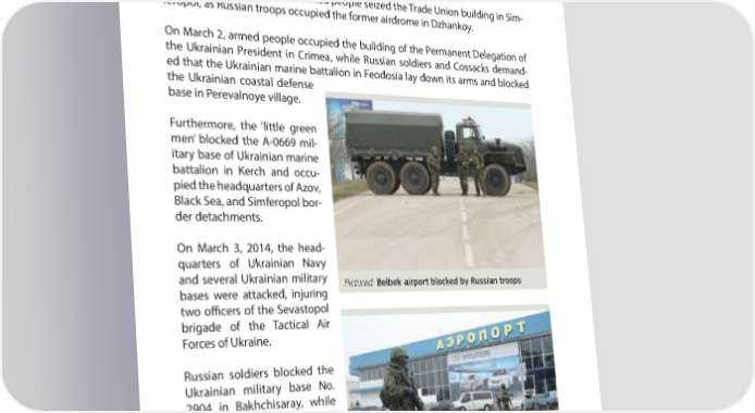 THE OCCUPATION OF CRIMEA: CHRONICLE OF SEIZURE PART 1 syonov said that the referendum on the status of Crimea would be held not on May 25, but on March 30. Not long after, Russian President Vladimir Putin asked for the Federation Council’s authorization to use Russian military forces ‘until the stabiliza- tion of the social and political situation’ in Ukraine. The Federation Council granted this request. On the same day, a group of armed people seized the Trade Union building in Sim- feropol, as Russian troops occupied the former airdrome in Dzhankoy. On March 2, armed people occupied the building of the Permanent Delegation of the Ukrainian President in Crimea, while Russian soldiers and Cossacks demand- ed that the Ukrainian marine battalion in Feodosia lay down its arms and blocked the Ukrainian coastal defense base in Perevalnoye village. Furthermore, the ‘little green men’ blocked the А-0669 mil- itary base of Ukrainian marine battalion in Kerch and occu- pied the headquarters of Azov, Black Sea, and Simferopol bor- der detachments. On March 3, 2014, the head- quarters of Ukrainian Navy and several Ukrainian military Pictured: Belbek airport blocked by Russian troops bases were attacked, injuring two o7 cers of the Sevastopol brigade of the Tactical Air Forces of Ukraine. Russian soldiers blocked the Ukrainian military base No. 2904 in Bakhchisaray, while Black Sea Fleet ships blocked the Ukrainian corvette ‘Ter- nopil’ and command ship ‘Slavutich’ in Sevastopol bay. Representative of the Russian Black Sea Fleet demanded that commanders of the Bel- Pictured: Simferopol international airport controlled by bek military base to change Russian troops 11