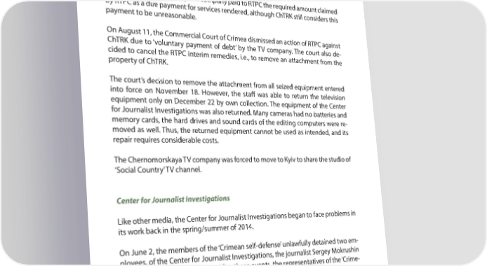 A YEAR AFTER: MAIN VIOLATIONS OF HUMAN RIGHTS IN CRIMEA PART 4 For some time, the representatives of the ‘Crimean self-defense’ occupied the com- pany’s premises. They blocked the access to the journalists of the Center for Jour- nalist Investigations leasing a part of the premises from ChTRK. Later, the access was provided, but some of the equipment of the Center for Journalist Investigations disappeared by that time. As a result, Chernomorskaya TV company paid to RTPC the required amount claimed by RTPC as a due payment for services rendered, although ChTRK still considers this payment to be unreasonable. On August 11, the Commercial Court of Crimea dismissed an action of RTPC against ChTRK due to ‘voluntary payment of debt’ by the TV company. The court also de- cided to cancel the RTPC interim remedies, i.e., to remove an attachment from the property of ChTRK. The court’s decision to remove the attachment from all seized equipment entered into force on November 18. However, the staT was able to return the television equipment only on December 22 by own collection. The equipment of the Center for Journalist Investigations was also returned. Many cameras had no batteries and memory cards, the hard drives and sound cards of the editing computers were re- moved as well. Thus, the returned equipment cannot be used as intended, and its repair requires considerable costs. The Chernomorskaya TV company was forced to move to Kyiv to share the studio of ‘Social Country’ TV channel. Center for Journalist Investigations Like other media, the Center for Journalist Investigations began to face problems in its work back in the spring/summer of 2014. On June 2, the members of the ‘Crimean self-defense’ unlawfully detained two em- ployees, of the Center for Journalist Investigations, the journalist Sergey Mokrushin and director Vladlen Melnikov. After these events, the representatives of the ‘Crime- an self-defense’, headed by the commander of the 1st Regiment of Simferopol peo- ple’s militia Dmitry Prostakov, unlawfully entered the editorial o7 ce of the Center for Journalist Investigations. According to the representatives of the paramilitary formation demanded to show the media registration documents and the lease agreement. The editorial board as- sociates the actions of ‘self-defense’ members with their intention to occupy the 105