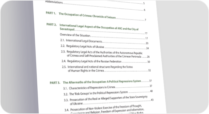 Contents Introduction. . . . . . . . . . . . . . . . . . . . . . . . . . . . . . . . . . . . . . . . . . . . . . . . . . . . . . . . . . . . . . . . . . . . . . . . . . . . 5 Abbreviations . . . . . . . . . . . . . . . . . . . . . . . . . . . . . . . . . . . . . . . . . . . . . . . . . . . . . . . . . . . . . . . . . . . . . . . . . . 6 PART 1. The Occupation of Crimea: Chronicle of Seizure . . . . . . . . . . . . . . . . . . . . . . . . . . . . 7 PART 2. International Legal Aspect of the Occupation of ARC and the City of Sevastopol. . . . . . . . . . . . . . . . . . . . . . . . . . . . . . . . . . . . . . . . . . . . . . . . . . . . . . . . . . . . . . . . . 17 Overview of the Situation. . . . . . . . . . . . . . . . . . . . . . . . . . . . . . . . . . . . . . . . . . . . . . . . . . . . 17 2.1. International Legal Documents. . . . . . . . . . . . . . . . . . . . . . . . . . . . . . . . . . . . . . . . . . 20 2.2. Regulatory Legal Acts of Ukraine . . . . . . . . . . . . . . . . . . . . . . . . . . . . . . . . . . . . . . . . 24 2.3. Regulatory Legal Acts of the Authorities of the Autonomous Republic of Crimea and Self-Proclaimed Authorities of the Crimean Peninsula . . . . . 28 2.4. Regulatory Legal Acts of the Russian Federation . . . . . . . . . . . . . . . . . . . . . . . . . 30 2.5. International and national structures Regarding the Status of Human Rights in the Crimea. . . . . . . . . . . . . . . . . . . . . . . . . . . . . . . . . . . . . . . . . . 32 PART 3. The Aftermaths of the Occupation: A Political Repressions System. . . . . . . . 37 3.1. Characteristics of Repressions in Crimea. . . . . . . . . . . . . . . . . . . . . . . . . . . . . . . . . 37 3.2. The ‘Risk Groups’ in the Political Repressions System . . . . . . . . . . . . . . . . . . . . . 40 3.3. Prosecution of the Real or Alleged Supporters of the State Sovereignty of Ukraine . . . . . . . . . . . . . . . . . . . . . . . . . . . . . . . . . . . . . . . . . . . . . . . . . . . . . . . . . . . . . . 43 3.4. Prosecution of Non-Violent Exercise of the Freedom of Thought, Conscience and Religion, Freedom of Expression and Information, Freedom of Peaceful Assembly and Association and Other Rights and Liberties . . . . . . . . . . . . . . . . . . . . . . . . . . . . . . . . . . . . . . . . . . . . . . . . . . . . . . . . . . . 45 3.5. Repressions Against the Crimean Tatar People as a Systemic Organized Opposition to the Occupation Regime. . . . . . . . . . . . . . . . . . . . . . . . . . . . . . . . . . . 48 3.6. Repressions Against any Forms of an Independent Civil Society . . . . . . . . . . 51 3.7. Conclusions . . . . . . . . . . . . . . . . . . . . . . . . . . . . . . . . . . . . . . . . . . . . . . . . . . . . . . . . . . . . 54 3
