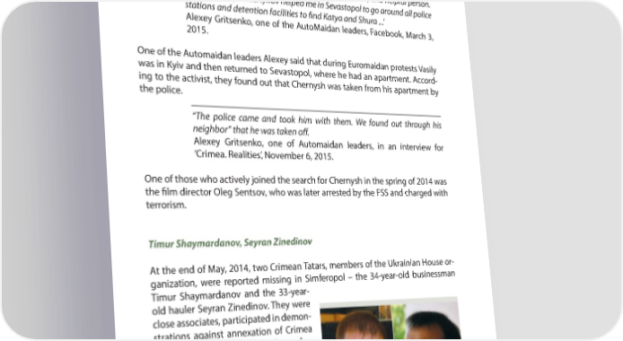 A YEAR AFTER: MAIN VIOLATIONS OF HUMAN RIGHTS IN CRIMEA PART 4 People lost touch with him on March 15, 2014. The day before the ‘referendum’ on the status of the Crimea he wrote his last Facebook post, and since then he has nev- er been seen or heard from. ‘Vasily Chernysh has disappeared, and there is indirect evidence that he may be no longer alive ... Vasily was very bright, bold, and helpful person. He and Sergey Hadzhynov helped me in Sevastopol to go around all police stations and detention facilities to + nd Katya and Shura ...’ Alexey Gritsenko, one of the AutoMaidan leaders, Facebook, March 3, 2015. One of the Automaidan leaders Alexey said that during Euromaidan protests Vasily was in Kyiv and then returned to Sevastopol, where he had an apartment. Accord- ing to the activist, they found out that Chernysh was taken from his apartment by the police. “The police came and took him with them. We found out through his neighbor” that he was taken oR . Alexey Gritsenko, one of Automaidan leaders, in an interview for ‘Crimea. Realities’, November 6, 2015. One of those who actively joined the search for Chernysh in the spring of 2014 was the R lm director Oleg Sentsov, who was later arrested by the FSS and charged with terrorism. Timur Shaymardanov, Seyran Zinedinov At the end of May, 2014, two Crimean Tatars, members of the Ukrainian House or- ganization, were reported missing in Simferopol – the 34-year-old businessman Timur Shaymardanov and the 33-year- old hauler Seyran Zinedinov. They were close associates, participated in demon- strations against annexation of Crimea and helped the Ukrainian military dur- ing the blockage of their military units by the ‘self-defense’ and ‘little green men’. According to Timur Shaymardanov, Le- onid Korzh, one of the activists of the Ukrainian House, disappeared on May 67