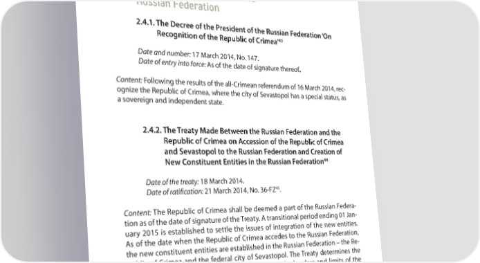 PART 2 INTERNATIONAL LEGAL ASPECT OF THE OCCUPATION OF ARC AND THE CITY OF SEVASTOPOL Federation with a proposal to accede the Republic of Crimea to the Russian Federa- tion as the new entity with a republican status. 2.4. Regulatory Legal Acts of the Russian Federation 2.4.1. The Decree of the President of the Russian Federation ‘On 43 Recognition of the Republic of Crimea’ Date and number: 17 March 2014, No. 147. Date of entry into force: As of the date of signature thereof. Content: Following the results of the all-Crimean referendum of 16 March 2014, rec- ognize the Republic of Crimea, where the city of Sevastopol has a special status, as a sovereign and independent state. 2.4.2. The Treaty Made Between the Russian Federation and the Republic of Crimea on Accession of the Republic of Crimea and Sevastopol to the Russian Federation and Creation of 44 New Constituent Entities in the Russian Federation Date of the treaty: 18 March 2014. 45 Date of rati+ cation: 21 March 2014, No. 36-FZ . Content: The Republic of Crimea shall be deemed a part of the Russian Federa- tion as of the date of signature of the Treaty. A transitional period ending 01 Jan- uary 2015 is established to settle the issues of integration of the new entities. As of the date when the Republic of Crimea accedes to the Russian Federation, the new constituent entities are established in the Russian Federation – the Re- public of Crimea and the federal city of Sevastopol. The Treaty determines the state languages of the new constituent entities, the borders and limits of the territories, the issues of citizenship, election to state government bodies of the new entities etc. 43 http://www.kremlin.ru/acts/bank/38202 44 http://kremlin.ru/events/president/news/20605 45 http://base.garant.ru/70618344/ 30
