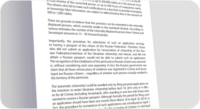 PART 4 A YEAR AFTER: MAIN VIOLATIONS OF HUMAN RIGHTS IN CRIMEA from the point of view of the occupying country. Meanwhile, the laws of RF provide for possible criminal responsibility for concealment of the second citizenship (for 4 Crimeans, this provision of the RF law will come into eT ect on January 1, 2016 ). After this date all Ukrainian citizens domiciled and registered in Crimea will have to make notiR cations about their Ukrainian citizenship. The concealment of the infor- mation about citizenship may entail criminal responsibility (Article 330-2 of the RF Criminal Code – punishable by a R ne of up to 200,000 rubles or in the amount of an annual income of the convicted person, or up to 400 hours of compulsory work). The citizens who fail to make such notiR cations in a due time or provide incomplete or knowingly false information, are subject to administrative R ne in the amount of 500 to 1,000 rubles. There are grounds to believe that this provision can be extended to the internally displaced persons, which currently reside in the mainland Ukraine. According to various estimates the number of the internally displaced persons from Crimea and Sevastopol amounts to 15 – 30 thousand people. Importantly, the procedure for submission of such an application envisag- es having a passport of the citizen of the Russian Federation. Therefore, those who did not submit an application for renunciation of citizenship of the Rus- sian Federation/retention of the Ukrainian citizenship (see below), and did not obtain a Russian passport, would not be able to submit such an application. The recognition of the inhabitants of the peninsula as Russian citizens was automat- ic, without considering each case separately. In fact, the Russian government can claim that all those whose place of residence was registered in Crimea and Sevas- topol are Russian citizens – regardless of whether such persons actually resided in the territory of the peninsula. The ‘automatic citizenship’ could be avoided only by R ling personal application on the intention to retain Ukrainian citizenship before April 18, 2014 only in 4 o7 c- es for all Crimea (including Sevastopol), after standing in one line with those who wanted to receive a Russian passport. Although formally the period for R ling such an application should have been one month (from March 18 to April 18, 2014), in fact, the procedure for acceptance of such applications was introduced on April 1 (the date of entry into force of the law On the accession of Crimea). In mid-April 2014, the additional o7 ces for registration of refusals from Russian citizenship were open (while, according to the Russian Federal Migration Service (FMS), the number of the o7 ces accepting documents on the RF passport was about 250). The actual term for R ling such applications was about three weeks. Moreover, these were not the o7 ces speciR cally designed for processing such applications, they accepted 4 http://www.rg.ru/2014/06/06/grajdanstvo-dok.html 82