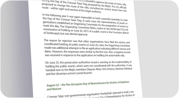 PART 4 A YEAR AFTER: MAIN VIOLATIONS OF HUMAN RIGHTS IN CRIMEA days, as well as classes, competitions, exhibitions, and other events involving hundreds of children. The music school holds an enrollment for the 2014-2015 academic years (audition) ... The accumulation of a large number of people in a limited area not intend- ed for placing of the further claimed number of participants can create conditions for violations of public order, rights, and lawful interests of other citizens.’ In addition, the Simferopol City Council refused to approve the route of motor rally during the Day of the Crimean Tatar Flag proposed by the Mejlis. The city o7 cials proposed to change the route of the rally, excluding the central streets from this route – within sight and earshot of the target audience. In the following year it was again impossible to hold a peaceful assembly to mark the Day of the Crimean Tatar Flag. In early June, the representatives of youth or- ganizations established an Organizing Committee for the preparation of events to mark this day. The Organizing Committee R led a notice to the Simferopol City Ad- ministration of holding on June 26, 2015 of a public event in the Fountains district of Simferopol, but was denied approval. The reason for rejection was that other organizations have R led the notices and coordinated holding of public events on June 26. Later, the Organizing Committee made two additional attempts to R le an application indicating diT erent venues and dates. However, the responses were similar to the R rst one. Also, a negative answer was received in response to the application on holding the automobile rally. On June 25, the prosecution authorities issued a warning on the inadmissibility of holding the public events, which were not coordinated with the authorities. It was handed over to the Mejlis members Dilyaver Akiev, Ilmi Umerov, Nariman Dzhelyal and the Ukrainian activist Leonid Kuzmin. August 23 – the Pan-European Day of Remembrance for Victims of Stalinism and Nazism Crimean Tatar non-governmental organization ‘Kardashlyk’ planned to hold a me- morial meeting in honor of the Pan-European Day of Remembrance for Victims of Stalinism and Nazism on August 23, 2014. The rally was to be held in Simferopol on Gurzufskaya Street in the Salgirka Park. The rally application was lodged with the Simferopol City Council on August 13, but ten days later the authorities banned the mourning rally, arguing for the hot weather, which, according to local authorities, could negatively aT ect the health of the meeting participants. 116