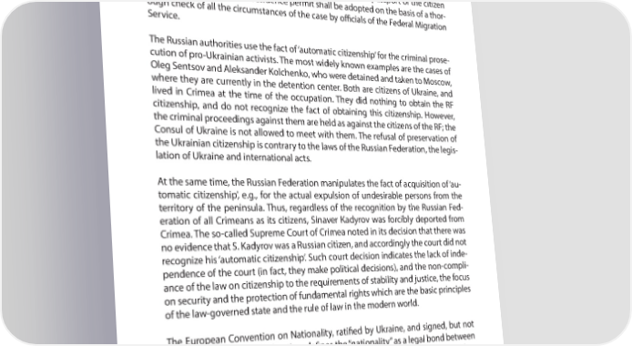 PART 4 A YEAR AFTER: MAIN VIOLATIONS OF HUMAN RIGHTS IN CRIMEA foreigners in Crimea. In order to obtain a residence permit or the RF passport, they were forced to prove the fact of their residence in Crimea through court actions. Not only a recourse to the court is associated with considerable costs, but it also cannot guarantee the obtaining of Russian citizenship or residence permit to these people. Even upon the availability of the court’s decision on establishing the fact of residence in Crimea or Sevastopol, the decision to issue the passport of the citizen of the Russian Federation /residence permit shall be adopted on the basis of a thor- ough check of all the circumstances of the case by o7 cials of the Federal Migration Service. The Russian authorities use the fact of ‘automatic citizenship’ for the criminal prose- cution of pro-Ukrainian activists. The most widely known examples are the cases of Oleg Sentsov and Aleksander Kolchenko, who were detained and taken to Moscow, where they are currently in the detention center. Both are citizens of Ukraine, and lived in Crimea at the time of the occupation. They did nothing to obtain the RF citizenship, and do not recognize the fact of obtaining this citizenship. However, the criminal proceedings against them are held as against the citizens of the RF; the Consul of Ukraine is not allowed to meet with them. The refusal of preservation of the Ukrainian citizenship is contrary to the laws of the Russian Federation, the legis- lation of Ukraine and international acts. At the same time, the Russian Federation manipulates the fact of acquisition of ‘au- tomatic citizenship’, e.g., for the actual expulsion of undesirable persons from the territory of the peninsula. Thus, regardless of the recognition by the Russian Fed- eration of all Crimeans as its citizens, Sinaver Kadyrov was forcibly deported from Crimea. The so-called Supreme Court of Crimea noted in its decision that there was no evidence that S. Kadyrov was a Russian citizen, and accordingly the court did not recognize his ‘automatic citizenship’. Such court decision indicates the lack of inde- pendence of the court (in fact, they make political decisions), and the non-compli- ance of the law on citizenship to the requirements of stability and justice, the focus on security and the protection of fundamental rights which are the basic principles of the law-governed state and the rule of law in the modern world. The European Convention on Nationality, ratiR ed by Ukraine, and signed, but not ratiR ed by the Russian Federation, deR nes the “nationality” as a legal bond between a person and a state without specifying the ethnic origin of a person. In addition, according to the position of the International Court of Justice in a decision (Notte- bohm case), nationality is a legal bond having as its basis a social fact of attachment, interests and sentiments, together with the existence of reciprocal rights and duties. Such ‘automatic’ obtaining of Russian citizenship by citizens of Ukraine in Crimea cannot be considered as legal, since the internal Russian procedures related to this 84