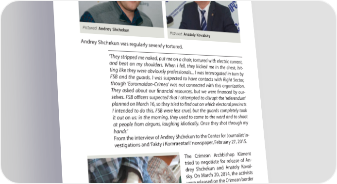 PART 4 A YEAR AFTER: MAIN VIOLATIONS OF HUMAN RIGHTS IN CRIMEA Pictured: Andrey Shchekun Pictured: Anatoly Kovalsky Andrey Shchekun was regularly severely tortured. ‘They stripped me naked, put me on a chair, tortured with electric current, and beat on my shoulders. When I fell, they kicked me in the chest, hit- ting like they were obviously professionals... I was interrogated in turn by FSB and the guards. I was suspected to have contacts with Right Sector, though ‘Euromaidan-Crimea’ was not connected with this organization. They asked about our + nancial resources, but we were + nanced by our- selves. FSB o4 cers suspected that I attempted to disrupt the ‘referendum’ planned on March 16, so they tried to + nd out on which electoral precincts I intended to do this. FSB were less cruel, but the guards completely took it out on us: in the morning, they used to come to the ward and to shoot at people from airguns, laughing idiotically. Once they shot through my hands.’ From the interview of Andrey Shchekun to the Center for Journalist In- vestigations and ‘Fakty i Kommentarii’ newspaper, February 27, 2015. The Crimean Archbishop Kliment tried to negotiate for release of An- drey Shchekun and Anatoly Koval- sky. On March 20, 2014, the activists were released on the Crimean border as a result of an exchange. Andrey Shchekun was immediately directed to a hospital in the Kherson region. After his release, Anatoly Kovalsky said that he preserved the hope of freedom due to Ukrainian songs he sang while captive. 60