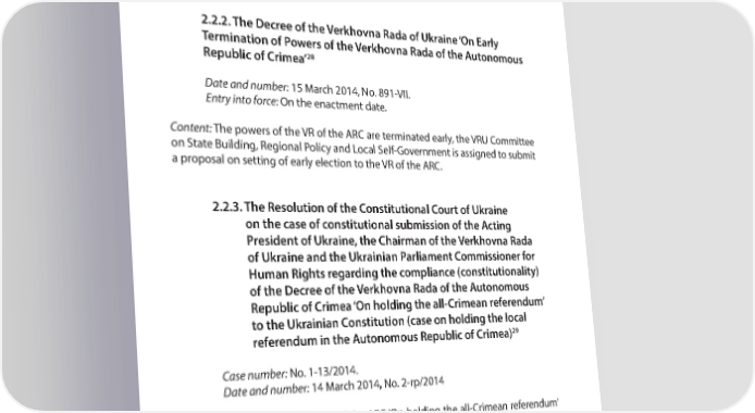 INTERNATIONAL LEGAL ASPECT OF THE OCCUPATION OF ARC AND THE CITY OF SEVASTOPOL PART 2 resolution of the VR of the ARC is not brought in line with the Ukrainian Constitution before 12 March 2014, the Verkhovna Rada of Ukraine will initiate the early termina- tion of powers of the VR of the ARC. The VRU deems it reasonable to appeal to the Venice Commission regarding the Resolution of the VR of the ARC dated 06 March 2014. The VRU calls on the inhabitants of the ARC to not participate in the illegal referendum. 2.2.2. The Decree of the Verkhovna Rada of Ukraine ‘On Early Termination of Powers of the Verkhovna Rada of the Autonomous 28 Republic of Crimea’ Date and number: 15 March 2014, No. 891-VII. Entry into force: On the enactment date. Content: The powers of the VR of the ARC are terminated early, the VRU Committee on State Building, Regional Policy and Local Self-Government is assigned to submit a proposal on setting of early election to the VR of the ARC. 2.2.3. The Resolution of the Constitutional Court of Ukraine on the case of constitutional submission of the Acting President of Ukraine, the Chairman of the Verkhovna Rada of Ukraine and the Ukrainian Parliament Commissioner for Human Rights regarding the compliance (constitutionality) of the Decree of the Verkhovna Rada of the Autonomous Republic of Crimea ‘On holding the all-Crimean referendum’ to the Ukrainian Constitution (case on holding the local 29 referendum in the Autonomous Republic of Crimea) Case number: No. 1-13/2014. Date and number: 14 March 2014, No. 2-rp/2014 Content: the Decree of the VR of the ARC ‘On holding the all-Crimean referendum’ of March 06, 2014 No. 1702-6/14.2 is recognized as unconstitutional and becoming void as of the day the Constitutional Court of Ukraine adopts this Resolution. It has also been decided to terminate the activity of the ARC Commission on holding and funding the all-Crimean referendum, ensuring the destruction of the ballots and campaign materials. 28 http://zakon3.rada.gov.ua/laws/show/891-18 29 http://www.ccu.gov.ua/doccatalog/document?id=242321 25
