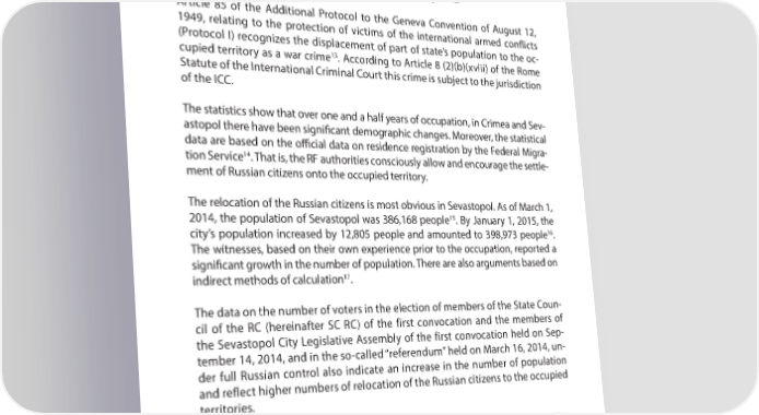 PART 4 A YEAR AFTER: MAIN VIOLATIONS OF HUMAN RIGHTS IN CRIMEA Despite the sad historical experience, the Russian Federation authorities, immedi- ately after the occupation of the territory of the Autonomous Republic of Crimea and Sevastopol have also begun to implement a policy aimed at populating the occupied territory with its ‘colonists’. This signiR cantly contributes to the change in the demographic situation in the occupied territory; as a result, the local population is displaced and replaced by the citizens of the occupying state. Article 85 of the Additional Protocol to the Geneva Convention of August 12, 1949, relating to the protection of victims of the international armed conU icts (Protocol I) recognizes the displacement of part of state’s population to the oc- cupied territory as a war crime13. According to Article 8 (2)(b)(xviii) of the Rome Statute of the International Criminal Court this crime is subject to the jurisdiction of the ICC. The statistics show that over one and a half years of occupation, in Crimea and Sev- astopol there have been signiR cant demographic changes. Moreover, the statistical data are based on the o7 cial data on residence registration by the Federal Migra- 14. That is, the RF authorities consciously allow and encourage the settle- tion Service ment of Russian citizens onto the occupied territory. The relocation of the Russian citizens is most obvious in Sevastopol. As of March 1, 15 2014, the population of Sevastopol was 386,168 people . By January 1, 2015, the 16 city’s population increased by 12,805 people and amounted to 398,973 people . The witnesses, based on their own experience prior to the occupation, reported a signiR cant growth in the number of population. There are also arguments based on 17 indirect methods of calculation . The data on the number of voters in the election of members of the State Coun- cil of the RC (hereinafter SC RC) of the first convocation and the members of the Sevastopol City Legislative Assembly of the first convocation held on Sep- tember 14, 2014, and in the so-called “referendum” held on March 16, 2014, un- der full Russian control also indicate an increase in the number of population and reflect higher numbers of relocation of the Russian citizens to the occupied territories. Thus, according to o7 cial data, the number of registered voters during the elec- tions of deputies to the LA of Sevastopol of the R rst convocation on 14.09.2014 13 https://www.icrc.org/rus/assets/R les/2013/ap_i_rus.pdf. 14 See methodological explanations: http://crimea.gks.ru/wps/wcm/connect/rosstat_ts/crimea/ru/statistics/population/ 15 http://31.28.228.102:82/statist_info/demograR a/chislo_naselenia/2014/ludi_0214.pdf 16 http://sevastopol.gks.ru/wps/wcm/connect/rosstat_ts/sevastopol/ru/statistics/population/ http://goo.gl/rBvm4A 17 http://www.c-inform.info/news/id/33955 92
