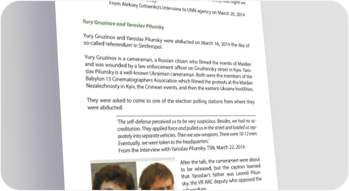 PART 4 A YEAR AFTER: MAIN VIOLATIONS OF HUMAN RIGHTS IN CRIMEA ment o7 ce in Simferopol. As a result of negotiations several days after the abduc- tion, on March 20, they were released near Chongar. ‘In our car there was also a guy with his legs shot. Then, he was taken to a hospital because his wounds began to fester. After that, the guys were tortured and interrogated for several days. And fortunately, that night we + nally were taken away.’ From Aleksey Gritsenko’s interview to UNN agency on March 20, 2014 Yury Gruzinov and Yaroslav Pilunsky Yury Gruzinov and Yaroslav Pilunsky were abducted on March 16, 2014 the day of so-called ‘referendum’ in Simferopol. Yury Gruzinov is a cameraman, a Russian citizen who R lmed the events of Maidan and was wounded by a law enforcement o7 cer on Grushevsky street in Kyiv. Yaro- slav Pilunsky is a well-known Ukrainian cameraman. Both were the members of the Babylon 13 Cinematographers Association which R lmed the protests at the Maidan Nezalezhnosty in Kyiv, the Crimean events, and then the eastern Ukraine hostilities. They were asked to come to one of the election polling stations from where they were abducted. ‘The self-defense perceived us to be very suspicious. Besides, we had no ac- creditation. They applied force and pulled us in the street and loaded us sep- arately into separate vehicles. Then we saw weapons. There were 10-12 men. Eventually, we were taken to the headquarters.’ From the interview with Yaroslav Pilunsky, TSN, March 22, 2014 After the talk, the cameramen were about to be released, but the captors learned that Yaroslav’s father was Leonid Pilun- sky, the VR ARC deputy who opposed the referendum. The cameramen of the Creative Associa- tion ‘Babylon 13’ were placed in diT erent rooms without windows. For several days, they were held captives in Chongar; Yury Pictured: Yury Gruzinov and Yaroslav Gruzinov was tortured and repeatedly Pilunsky beaten. 64