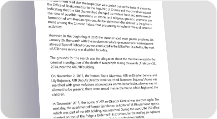 A YEAR AFTER: MAIN VIOLATIONS OF HUMAN RIGHTS IN CRIMEA PART 4 On September 24, Elzara Islyamova, the ETR TV Channel Director General, received a letter from the Extremism Combating Center of the Russian Interior Ministry in the Republic of Crimea demanding to provide the certiR ed copies of the registration documents and approvals giving the right to perform activities, as well as the lease agreement for occupied premises, the channel’s staT schedule, the list of persons o7 cially employed by the channel, and employees’ job description. The document read that the inspection was carried out on the basis of a letter to the O7 ce of Roskomnadzor in the Republic of Crimea and the city of Sevastopol indicating that the ATR channel had changed its content focus and ‘perseveres in the idea of possible repressions on ethnic and religious grounds, promotes the formation of anti-Russian opinions, deliberately enkindles distrust to the govern- ment among the Crimean Tatars, thus presenting an indirect threat of extremist activities’. However, in the beginning of 2015 the channel faced even greater problems. On January 26, the search with the involvement of a large number of armed represent- atives of Special Police Forces was conducted in the ATR o7 ce. Due to this, the work of ATR news service was disabled for a day. The grounds for the search was the allegation about the materials related to the criminal investigation of the death of two people during the events of February 26, 2014, near the ARC VR building. On November 2, 2015, the homes Elzara Islyamova, ATR ex-Director General and Lily Bujurova, ATR Deputy Director were searched. Moreover, Bujurova’s home was searched with gross violations of procedural norms. In particular, a lawyer was not allowed to be present; there were armed men in the house, which frightened the children. In December 2015, the home of ATR ex-Director General was searched again. The next day, the apartment of Roman Spiridonov, ex-Editor of ‘15 Minutes’ news agency, which was part of the ATR holding, was searched. During the search, the FSS o7 cer planted on top of the fridge a folder with instructions for the making an explosive device, which resulted in subpoenaing of Spiridonov for interrogation. The ATR TV channel made four attempts to obtain a Russian license, but failed to get a permit to broadcast in Crimea. Moreover, the “head” of Crimea Sergey Ak- syonov accused the TV channel’s leadership of deliberated delay of the obtaining of broadcasting license. According to him, the channel intentionally made mis- takes in the documents required for the obtaining of the license in order to over- blow a scandal. 103