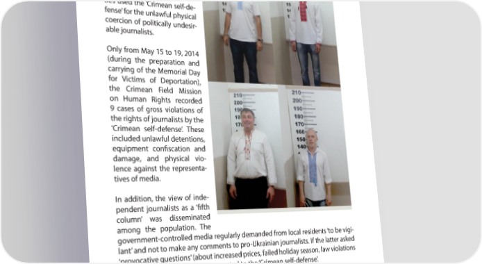 A YEAR AFTER: MAIN VIOLATIONS OF HUMAN RIGHTS IN CRIMEA PART 4 ual journalists who have been critical of the state of things on the peninsula still remained. In a situation when Crimea was just starting to accede the le- gal framework of the Russian Federation, the new authori- ties used the ‘Crimean self-de- fense’ for the unlawful physical coercion of politically undesir- able journalists. Only from May 15 to 19, 2014 (during the preparation and carrying of the Memorial Day for Victims of Deportation), the Crimean Field Mission on Human Rights recorded 9 cases of gross violations of the rights of journalists by the ‘Crimean self-defense’. These included unlawful detentions, equipment conR scation and damage, and physical vio- lence against the representa- tives of media. In addition, the view of inde- pendent journalists as a ‘R fth column’ was disseminated among the population. The government-controlled media regularly demanded from local residents ‘to be vigi- lant’ and not to make any comments to pro-Ukrainian journalists. If the latter asked ‘provocative questions’ (about increased prices, failed holiday season, law violations etc.), this was supposed to be reported to the ‘Crimean self-defense’. All this led to the creation of an environment in which journalists are afraid to crit- icize the government and cover the problems of the peninsula. The situation is ag- gravated by the fact that all self-defense’s attacks on journalists have not yet been investigated by Crimean authorities, which creates an atmosphere of impunity for the perpetrators. As a result, most of the independent journalists either left the ter- ritory of Crimea or ceased to openly criticize the policy of the RF. 99