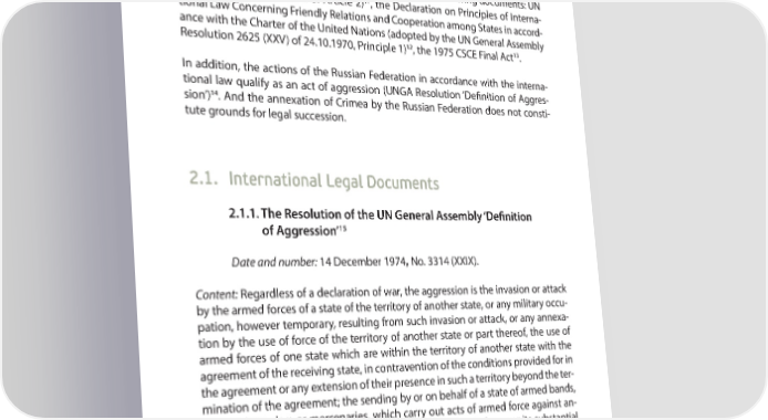 PART 2 INTERNATIONAL LEGAL ASPECT OF THE OCCUPATION OF ARC AND THE CITY OF SEVASTOPOL by the parties), which in turn implies the need for application to these territories of provisions of the international humanitarian law. By its actions of forced seizure of the government bodies and the occupation of the Crimean peninsula (for more detail see Part 1) Russia has violated the basic norms of the international law, in particular, those set out in the following documents: UN 11 Charter (26.06.1945, Part 4 of Article 2) , the Declaration on Principles of Interna- tional Law Concerning Friendly Relations and Cooperation among States in accord- ance with the Charter of the United Nations (adopted by the UN General Assembly 12 13 Resolution 2625 (XXV) of 24.10.1970, Principle 1) , the 1975 CSCE Final Act . In addition, the actions of the Russian Federation in accordance with the interna- tional law qualify as an act of aggression (UNGA Resolution ‘DeR nition of Aggres- sion’)14. And the annexation of Crimea by the Russian Federation does not consti- tute grounds for legal succession. 2.1. International Legal Documents 2.1.1. The Resolution of the UN General Assembly ‘De> nition 15 of Aggression’ Date and number: 14 December 1974, No. 3314 (XXIX). Content: Regardless of a declaration of war, the aggression is the invasion or attack by the armed forces of a state of the territory of another state, or any military occu- pation, however temporary, resulting from such invasion or attack, or any annexa- tion by the use of force of the territory of another state or part thereof, the use of armed forces of one state which are within the territory of another state with the agreement of the receiving state, in contravention of the conditions provided for in the agreement or any extension of their presence in such a territory beyond the ter- mination of the agreement; the sending by or on behalf of a state of armed bands, groups, irregulars or mercenaries, which carry out acts of armed force against an- other state of such gravity as to amount to the acts listed above, or its substantial involvement therein. 11 http://www.un.org/ru/charter-united-nations/index.html 12 http://www.un.org/ru/documents/decl_conv/declarations/intlaw_principles.shtml 13 http://zakon4.rada.gov.ua/laws/show/994_055 14 http://www.un.org/ru/documents/decl_conv/conventions/aggression.shtml 15 http://www.un.org/ru/documents/decl_conv/conventions/aggression.shtml 20