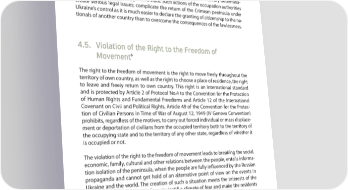 A YEAR AFTER: MAIN VIOLATIONS OF HUMAN RIGHTS IN CRIMEA PART 4 do not comply with the applicable international conventions, customary interna- tional law, and the principles of laws on citizenship. In fact, Russia has not only occupied a part of the territory of Ukraine, but also took control over the majority of the population of this territory, depriving it of the free- dom of choice. Such actions represent a terrible precedent of arbitrary determina- tion of man’s fate by an aggressive state. Such actions of the occupation authorities create serious legal issues; complicate the return of the Crimean peninsula under Ukraine’s control as it is much easier to declare the granting of citizenship to the na- tionals of another country than to overcome the consequences of the lawlessness. 4.5. Violation of the Right to the Freedom of Movement6 The right to the freedom of movement is the right to move freely throughout the territory of own country, as well as the right to choose a place of residence, the right to leave and freely return to own country. This right is an international standard and is protected by Article 2 of Protocol No.4 to the Convention for the Protection of Human Rights and Fundamental Freedoms and Article 12 of the International Covenant on Civil and Political Rights. Article 49 of the Convention for the Protec- tion of Civilian Persons in Time of War of August 12, 1949 (IV Geneva Convention) prohibits, regardless of the motives, to carry out forced individual or mass displace- ment or deportation of civilians from the occupied territory both to the territory of the occupying state and to the territory of any other state, regardless of whether it is occupied or not. The violation of the right to the freedom of movement leads to breaking the social, economic, family, cultural and other relations between the people, entails informa- tion isolation of the peninsula, when the people are fully inU uenced by the Russian propaganda and cannot get hold of an alternative point of view on the events in Ukraine and the world. The creation of such a situation meets the interests of the occupying authorities and allows to instill a climate of fear and make the residents of the peninsula feel hopeless. The violation of the freedom of movement greatly increases a person’s vulnerability before the state, when it becomes clear that there is no place to escape to. The vio- 6 A more detailed study on the violation of the right to the freedom of movement under occupation can be found in the thematic review Crimea Without Rules// http://crimeahumanrights.org/wp-content/uploads/2015/11/ Crimea_Beyond_Rules_RU._Issue_1.pdf 85