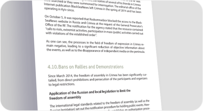 A YEAR AFTER: MAIN VIOLATIONS OF HUMAN RIGHTS IN CRIMEA PART 4 Romania and Moldova. The portal focuses on coverage of sailing to Crimea of ves- sels violating the sanctions regime adopted by various countries and organizations in connection with the Russian occupation of Crimea. The editor in chief of the Internet publication BlackSeaNews Andrey Klimenko said that in Crimea a criminal case under Art. 280.1 of the Criminal Code of the RF was opened against him. According to him, the homes of several of his friends in Crimea were searched or they were summoned for interrogation. The editorial o7 ce of the Internet publication BlackSeaNews left Crimea in the spring of 2014 and has been operating in Kyiv since. On October 5, it was reported that Roskomnadzor blocked the access to the Black- SeaNews website in Russia and Crimea at the request of the General Prosecutor’s O7 ce of the RF. The notiR cation for the agency stated that the resource contained “calls to riots, extremist activities, participation in mass (public) activities carried out with violations of the established order”. As one can see, the processes in the R eld of freedom of expression in Crimea re- main negative, leading to a signiR cant reduction of objective information about the events, as well as to the disappearance of independent media on the peninsula. 4.10. Bans on Rallies and Demonstrations Since March 2014, the freedom of assembly in Crimea has been signiR cantly cur- tailed, from direct prohibitions and persecution of the participants and organizers to legal restrictions. Application of the Russian and local legislation to limit the freedom of assembly The international legal standards related to the freedom of assembly (as well as the Russian legislation) set out the notiR cation procedure for holding public events. How- ever, in practice, the Russian legislation actually establishes an authorization proce- dure. In addition, in July 2014, the RF adopted the law establishing criminal liability for repeated violation of the order of organizing or conducting of mass events. The organizers of public events are also obliged to prevent an access to public events for citizens with weapons, objects or substances which may pose a threat to others. The ban is also introduced to disengage children under 14 in participa- tion in social and political events. 109