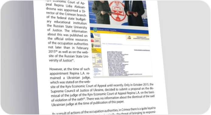 A YEAR AFTER: MAIN VIOLATIONS OF HUMAN RIGHTS IN CRIMEA PART 4 violated the oath and were appointed to positions by the occupation authorities in Crimea has not always been consistent. For example, a judge of the Kyiv Economic Court of Ap- peal Repina Lidia Aleksan- drovna was appointed a Di- rector of the Crimean branch of the federal state budget- ary educational institution the Russian State University of Justice. The information about this was published on the o7 cial online resources of the occupation authorities not later than in February 40 2015 as well as on the web- site of the Russian State Uni- 41 versity of Justice . However, at the time of such appointment Repina L.A. re- mained a Ukrainian judge, which was stated on the web- site of the Kyiv Economic Court of Appeal until recently. Only in October 2015, the Supreme Council of Justice of Ukraine, decided to submit a proposal on the dis- missal of the judge of the Kyiv Economic Court of Appeal Repina L.A. on the basis 42 of violation of the oath . There was no information about the dismissal of the said Ukrainian judge at the time of publication of this paper. As a result of actions of the occupation authorities, in Crimea there is a quite loyal to the occupying state system of justice. Ironically, the threat of bringing to responsi- bility on the part of Ukraine only increases the degree of such loyalty. The absence of hope for a fair trial makes Crimean population even more obedient to the occu- pation authorities. 40 http://crb.rgup.ru/?mod=media&id=1001 41 http://crb.rgup.ru/?mod=news&id=2107 42 http://www.vru.gov.ua/news/1106 131