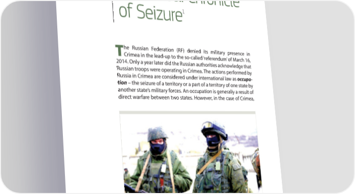 The Occupation PART 1 of Crimea: Chronicle of Seizure1 1 he Russian Federation (RF) denied its military presence in TCrimea in the lead-up to the so-called ‘referendum’ of March 16, 2014. Only a year later did the Russian authorities acknowledge that Russian troops were operating in Crimea. The actions performed by Russia in Crimea are considered under international law as occupa- tion – the seizure of a territory or a part of a territory of one state by another state’s military forces. An occupation is generally a result of direct warfare between two states. However, in the case of Crimea, Pictured: ‘Little green men’ 1 This section has been prepared by Olga Skrypnyk, Crimea Human Rights Group 7